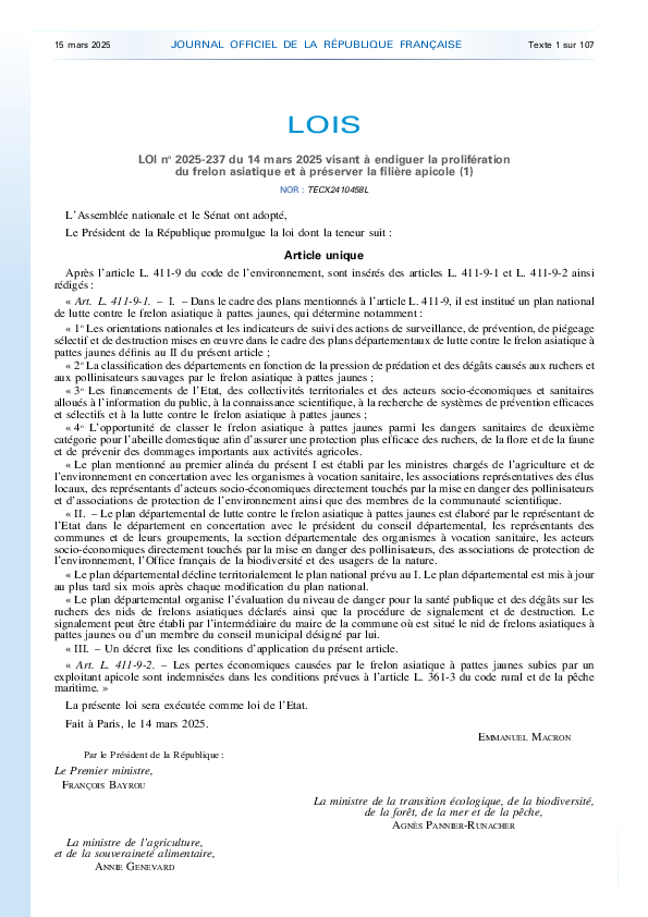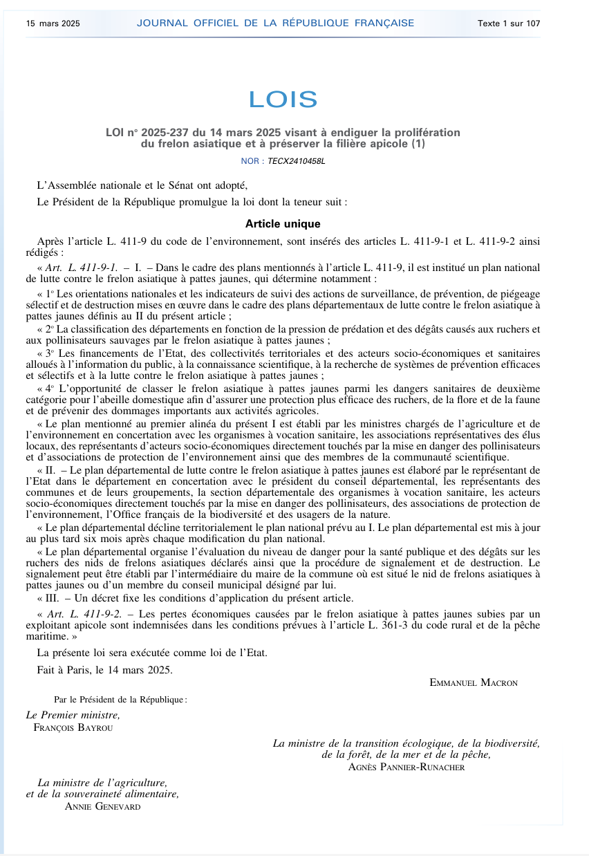 Loi 2025-237 du 14 mars 2025: Endiguer la Prolifération du Frelon Asiatique et préserver la filière Apicole